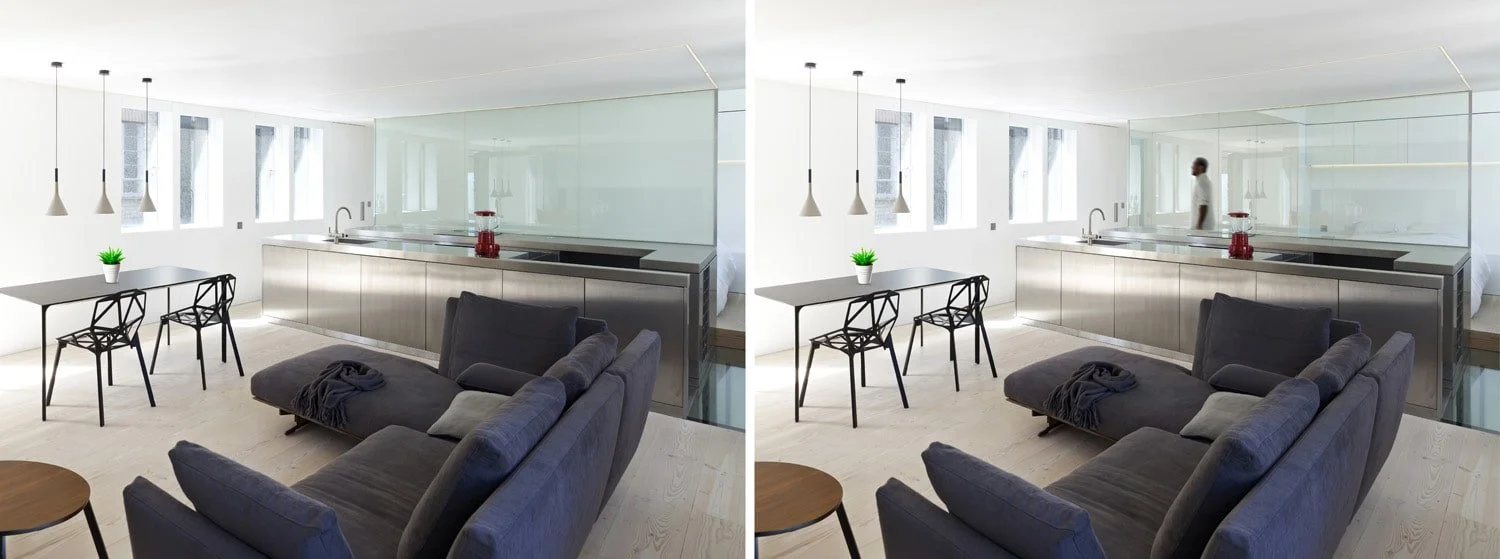 Island Home redefines conventional space boundaries with an innovative electro-chromatic glass screen integrated into the central island, seamlessly connecting the bedroom and kitchen/living area. With a simple switch, this cutting-edge smart glass turns translucent, offering bespoke privacy when needed. The design embraces flexibility, enabling adjustable views for privacy. When transparent, the screen allows abundant natural light to fill the living space, and the extended view effectively doubles the perceived size of this luxury urban home.