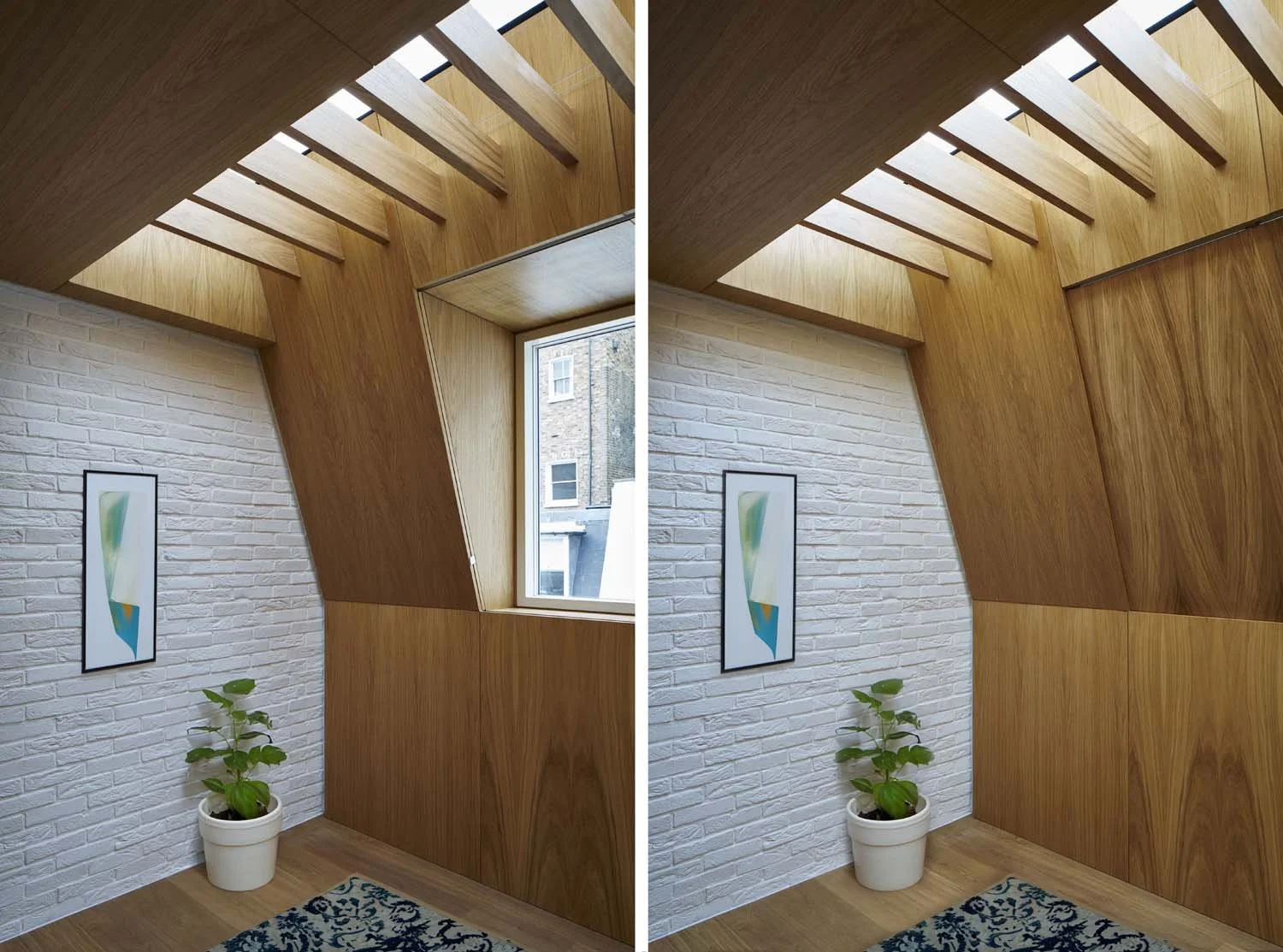 A three-bedroom renovation of a London Mews House features a bespoke timber staircase. The design reflects Japanese aesthetics, integrating Shoji screen elements into the home's luxury ambiance.